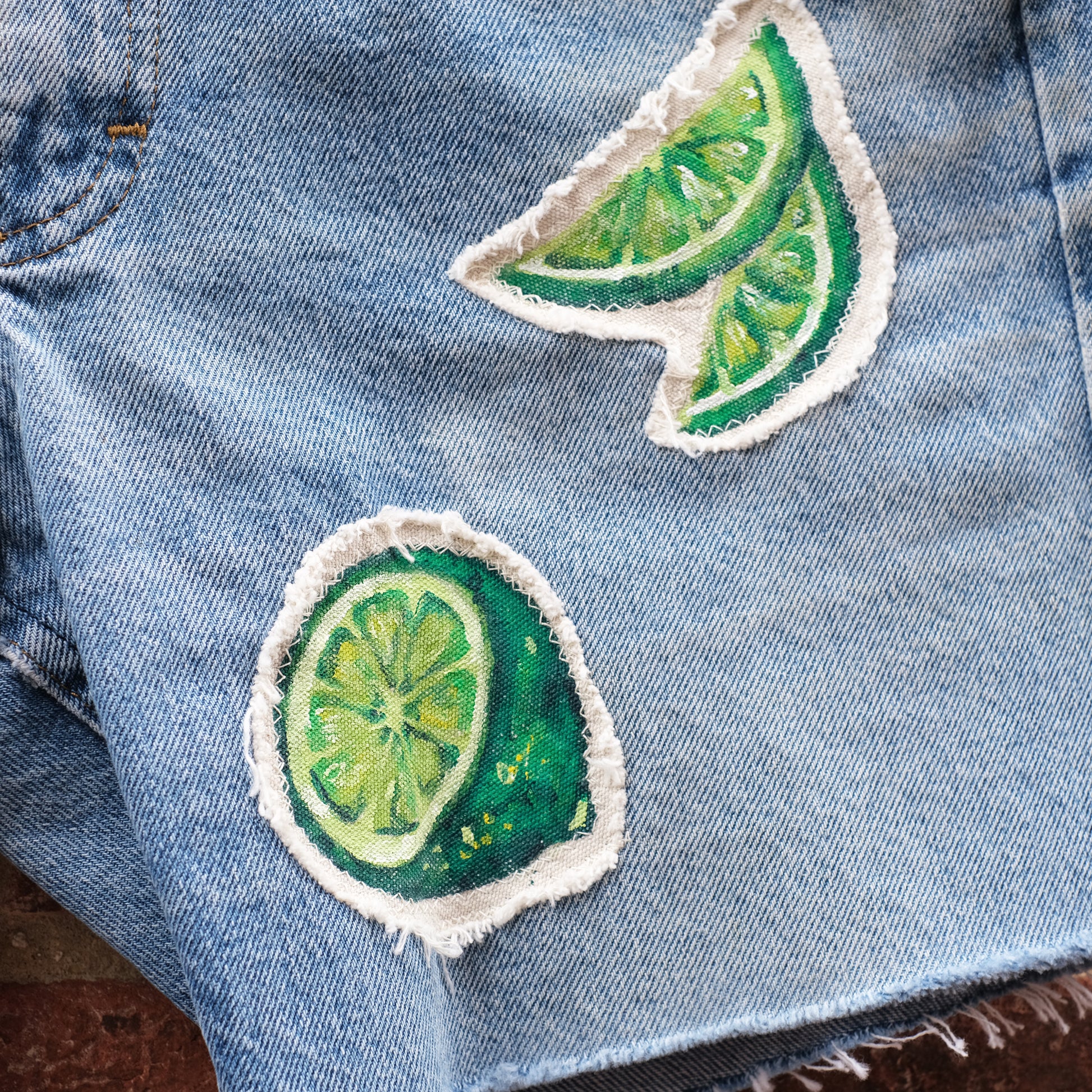 - Treatment: Cropped + hand painted patches